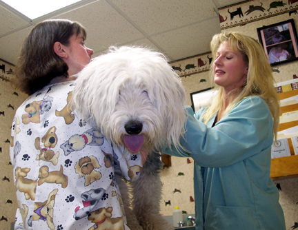 Patrick's doctor checked his paws.   She snipped some hair between the pads of his feet.  She repeated this pawcedure on each leg.