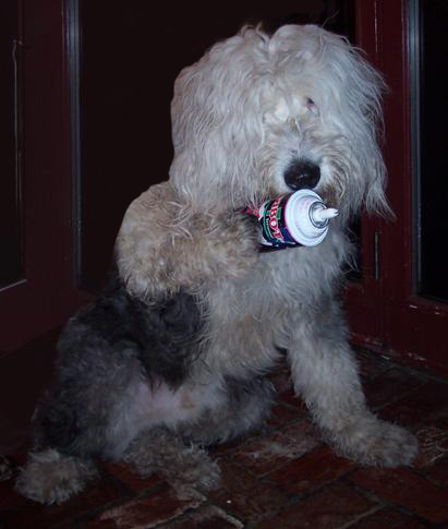 Molly got a big glob of whipped cream on her face.  She was able to lick it off everywhere except for the top of her snout!