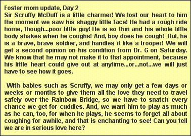 "Tomorrow you will meet your Foster Moms, Connie and Michelle," said Judy. "They are very special rescue angels and they will take you to a vet to see if anything else can be done for you."