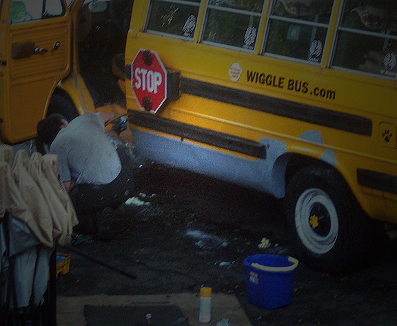 The sheepies were also under strict orders to stay inside, away from the driveway "operating room".  Michael knew it would be upsetting for them to see Wigglebus in surgery. As he worked away, the only sound that could be heard was the reciprico saw buzzing away Wiggle's bad spots.