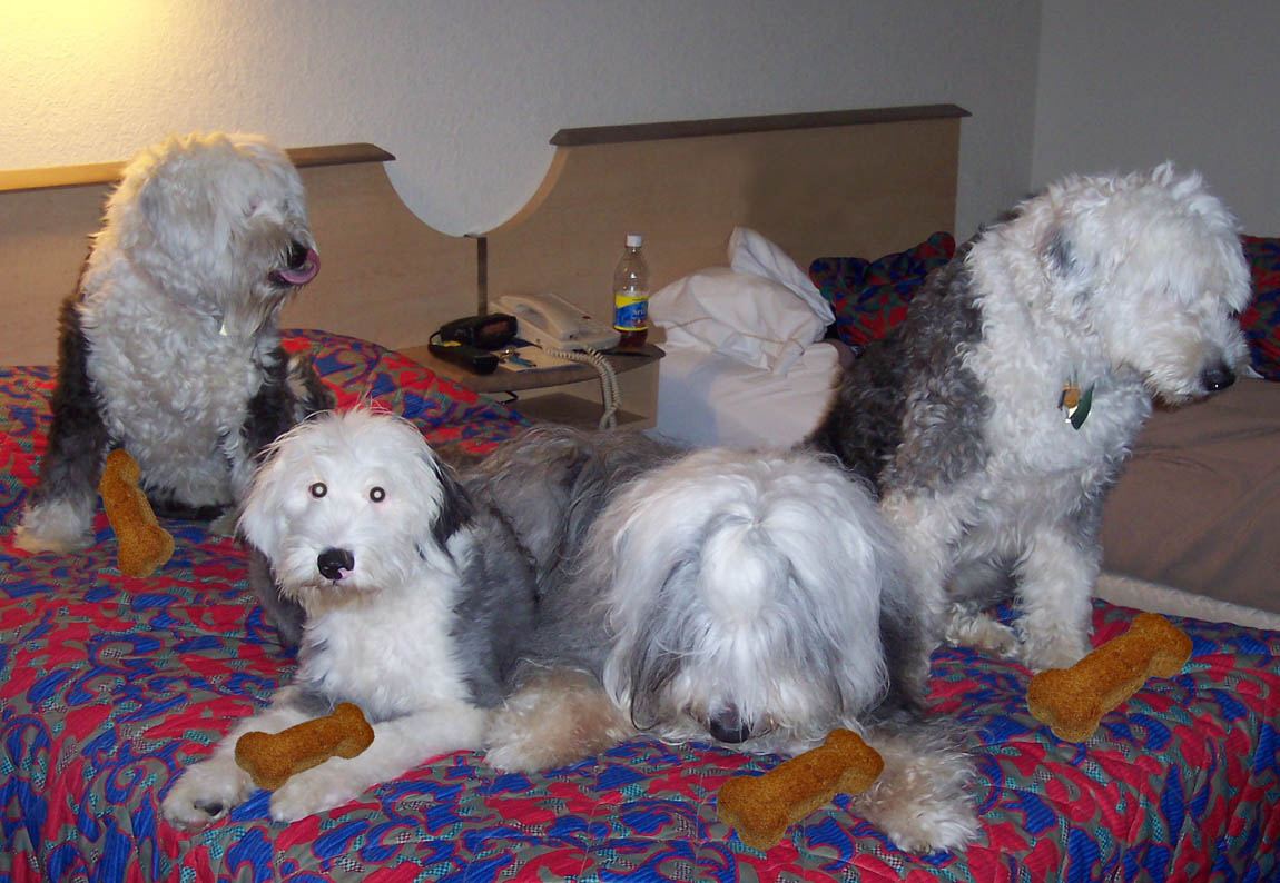 As the Bobtail Gate party was winding down, the sheepies hunkered together in the giant hotel beds.